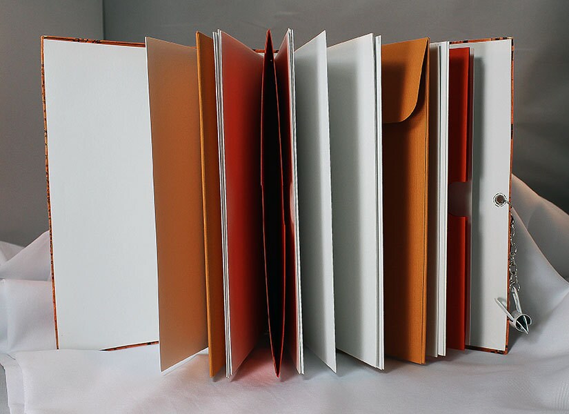 The journal measures 7.75 in x 5 in x 2 in and is made with 140lb mixed media paper. The pockets and envelopes are made using 65lb card stock paper and reinforced at the spine with tyvek.