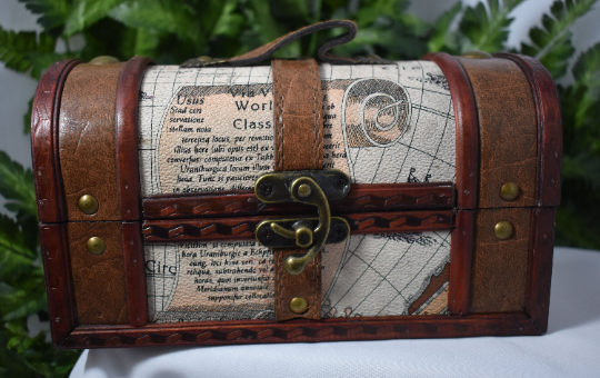The dragon eggs are made of polymer clay and the treasure chest measures 8 1/2 inches x 4 inches x 4 3/4 inches tall. The eggs are approximately 2 inches tall. This chest with its hidden treasure would make a great addition to your end table, bookshelf, or any other place where it can be protected.