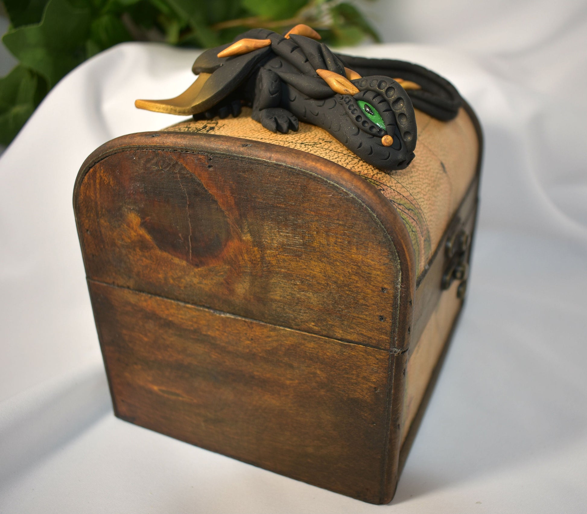 This item is a beautiful polymer clay black and orange dragon with orange eyes laying on a lovely brown chest decorated in a map scene.