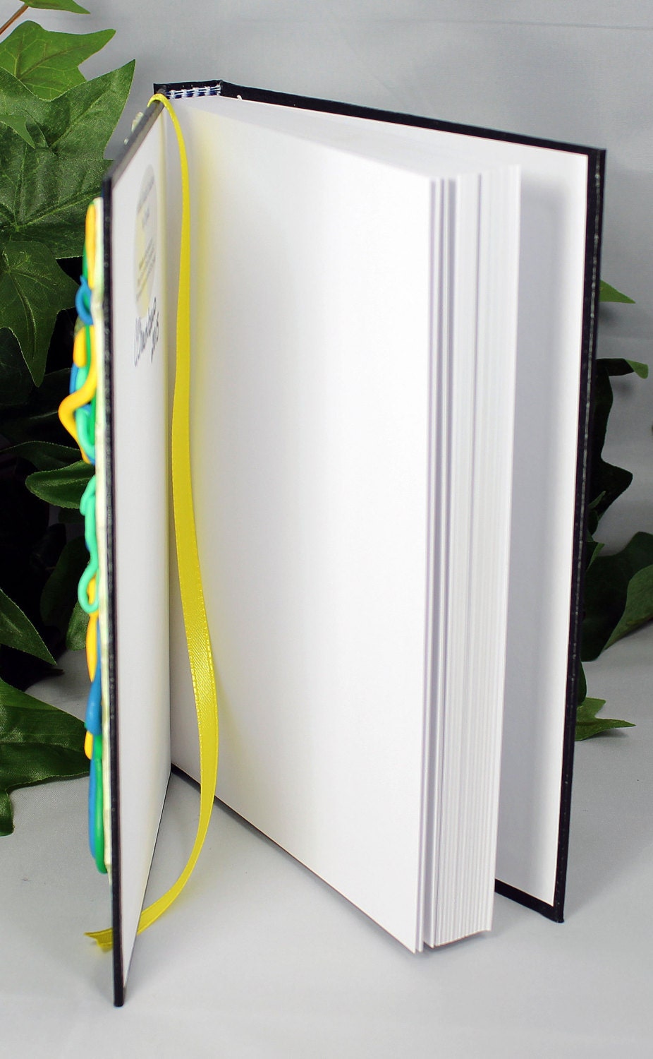 There are two glass stones with flowers on them surrounded by blues, greens, and yellow. The cover has been hand sculpted and hand painted. This book would make the perfect addition to any journal collection. There are over 150 pages of blank, unlined, heavy weight 65lb, acid free paper perfect for writing, drawing, or even doodling. This paper is ideal for pencil, crayon, charcoal, and pastel. The journal measures 8.25 in x 5.75 in and has a hardbound black cover under the clay.