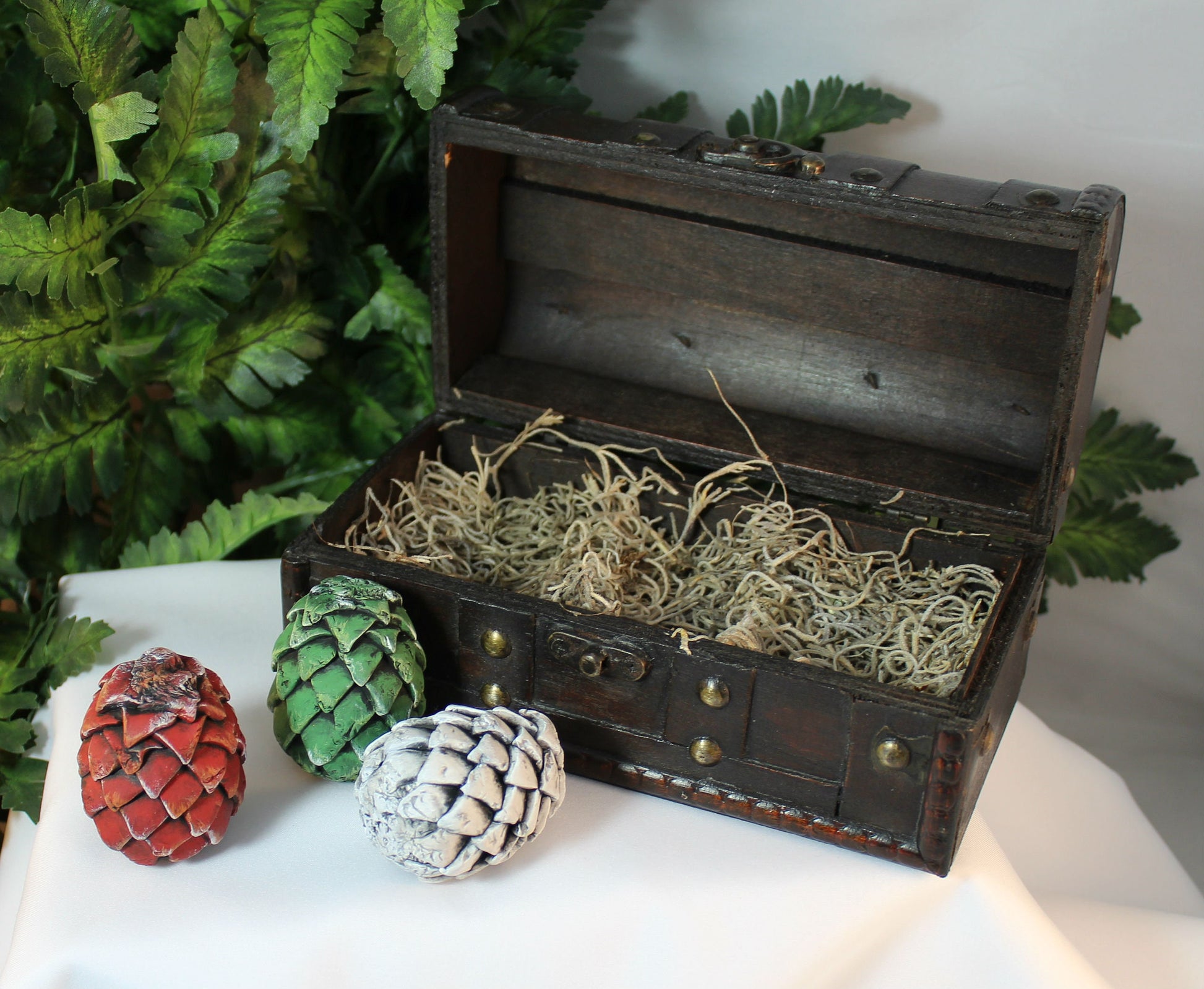 This item is a set of beautiful miniature dragon eggs hand-sculpted and resting inside a pretty decorative chest. Now you can have your very own House of the Dragon or Game of Thrones egg set.