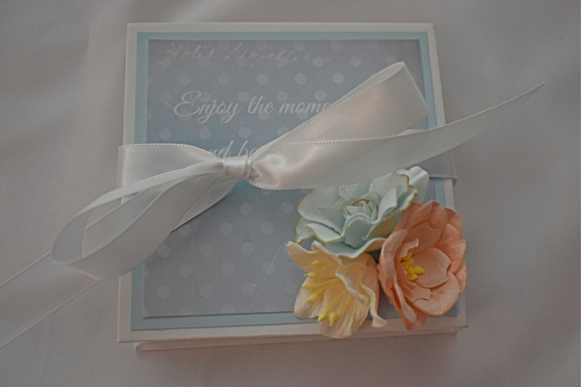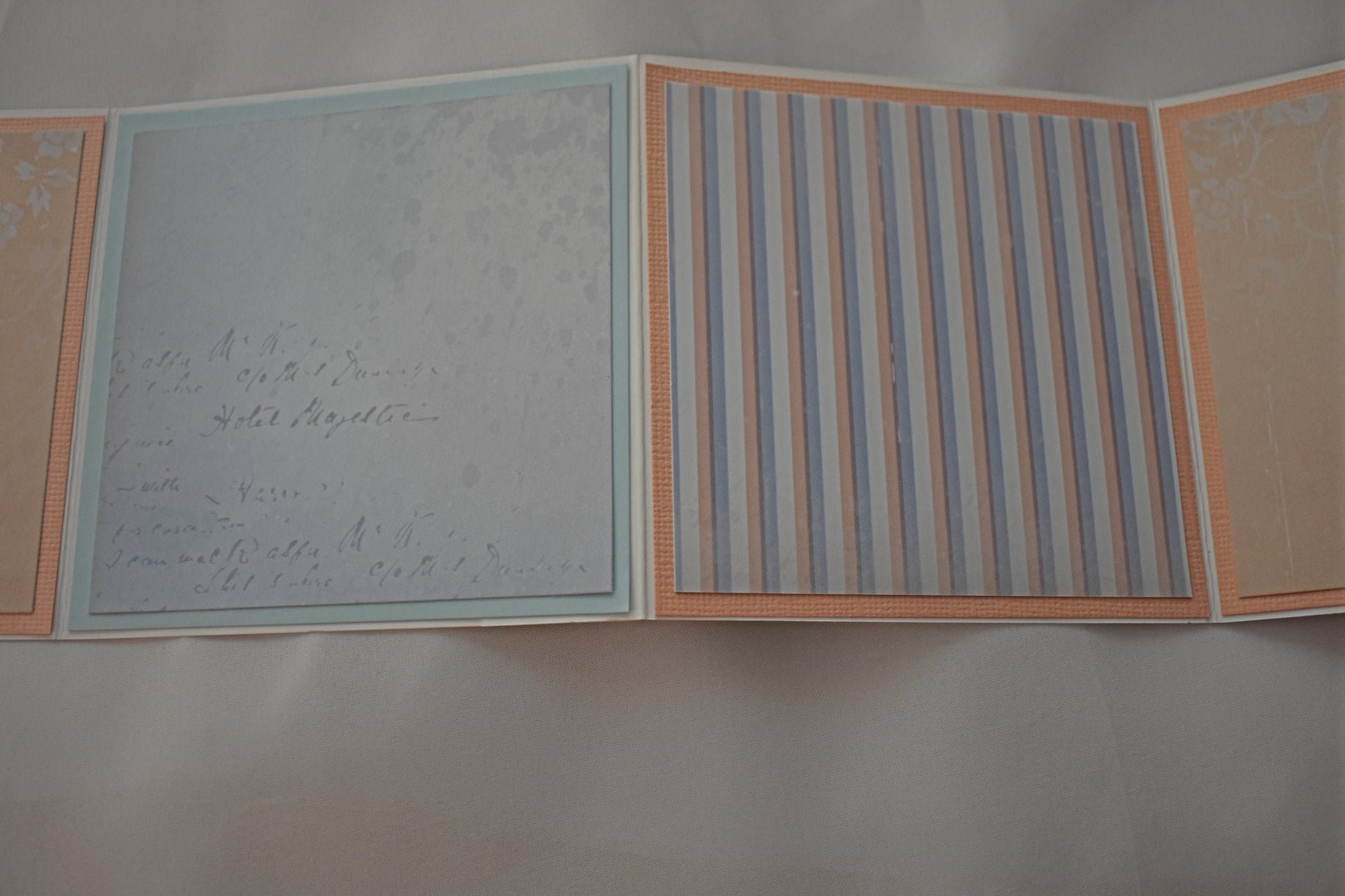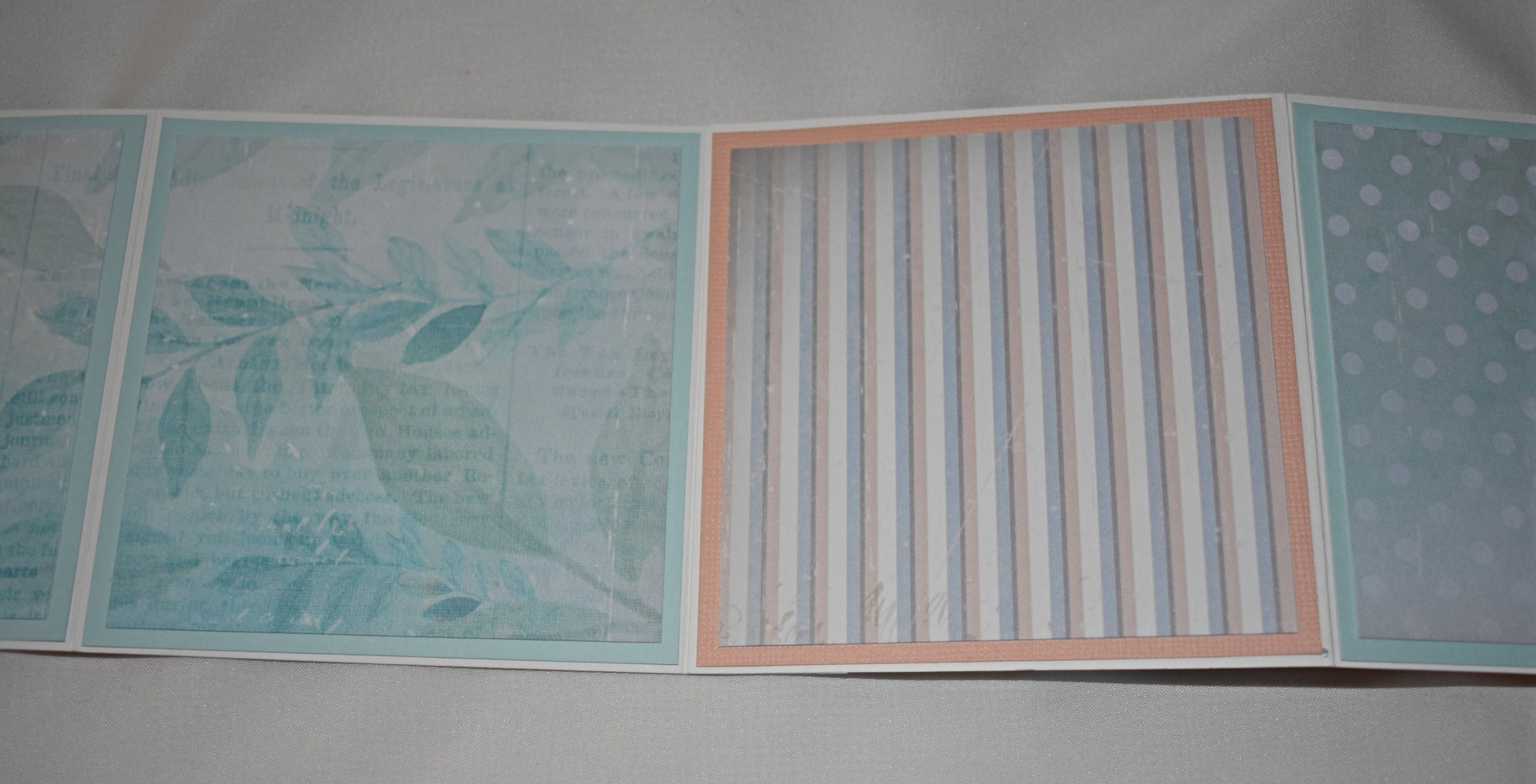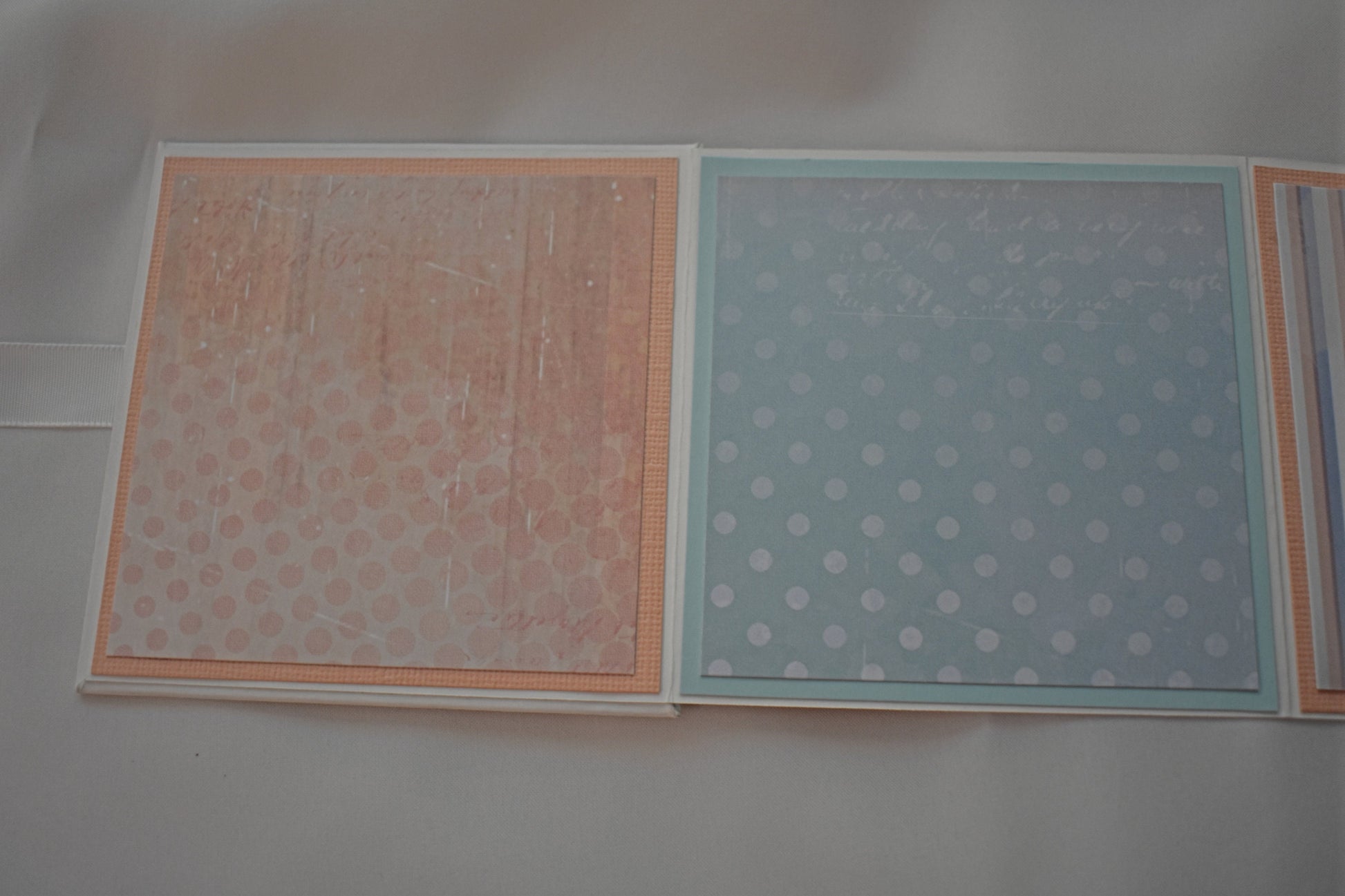 The entire album has 15 photo/journal spots. This cute little accordion album will make a beautiful addition to your coffee table or shelf. The pages are made using plain colored card stock and a pattern card stock giving you beautiful places to put your pictures that you want to cherish for a lifetime.